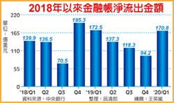 中央銀行20日公布第一季國際收支,其中金融帳淨流出增至170.8億美元,主要是外資大減台股176.5億美元、創史上單季最大,至於金融帳已連續39季,續創史上最長淨流出紀錄,累計淨流出4,821.1億美元,以3月底新台幣的匯率計算,約合新台幣14.59兆元,換算約當六年的歲收總合。